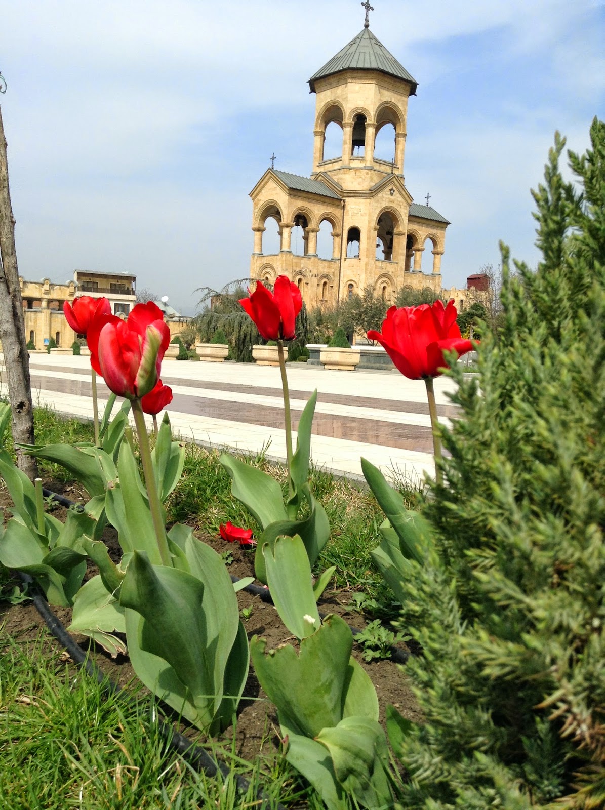 Тбилиси, апрель тюльпаны и колокольня при кафедральном храме